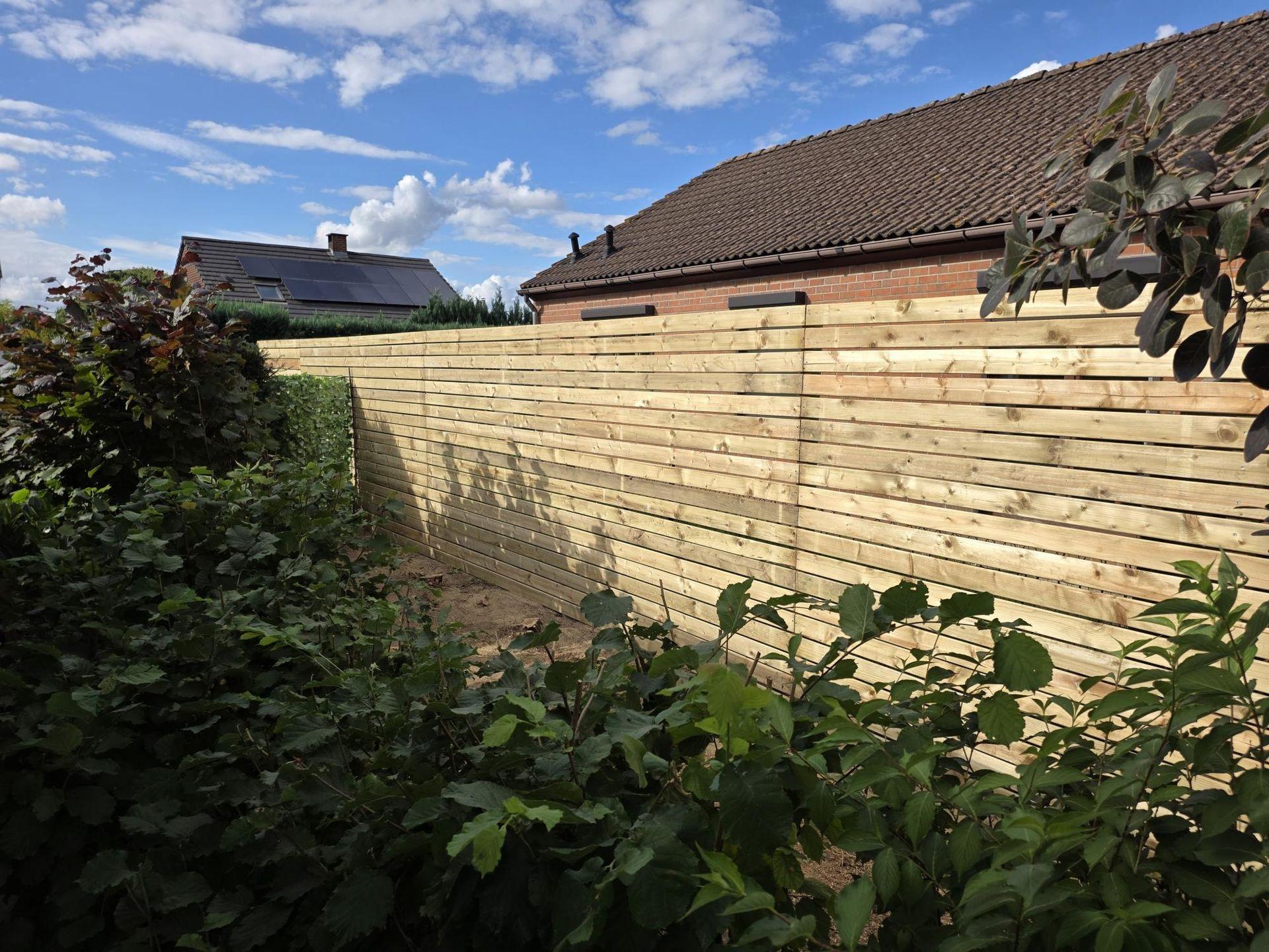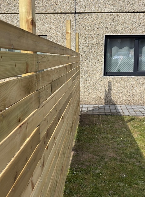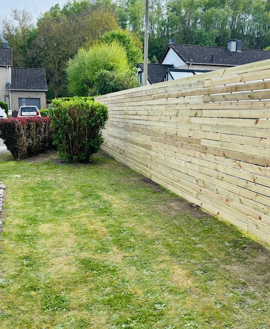 7. Création de séparation, clôture Pour délimiter un espace, votre jardin, votre propriété, nous créons une clôture sur mesure fabriquée à l'aide de bois traité sel, panneau soudé, acier corten, ... Nous utilisons du bois de sapin traité au sel, d'une grande durabilité, qui ne nécessite aucun entretien supplémentaire. Votre clôture résistera aux intempéries tout en restant belle et sécurisées pour des années. Il s'agit d'une clôture "signature" de notre entreprise. Nous plaçons aussi tout type de clôture comme des panneaux soudés, grillages souples, béton, ...
